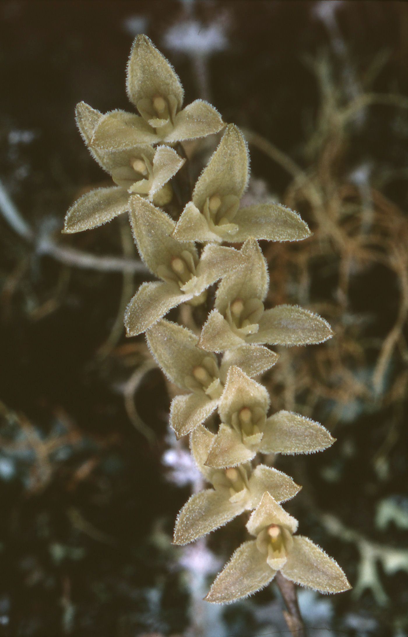 Found in Peru and Bolivia at elevations around 2400 meters as a mini-miniature sized, cold growing epiphyte with slender, erect ramicauls enveloped by 2 to 3 thin, tubular sheaths and carrying a single, erect, thickly coriaceous, elliptical, obtuse to rounded, cuneate below into the petiolate base leaf that blooms in the spring on a loose, secund, 2 to 4" [5 to 10 cm] long, simultaneously several flowered inflorescence arising through a spathe with an annulus below the base of the leaf.