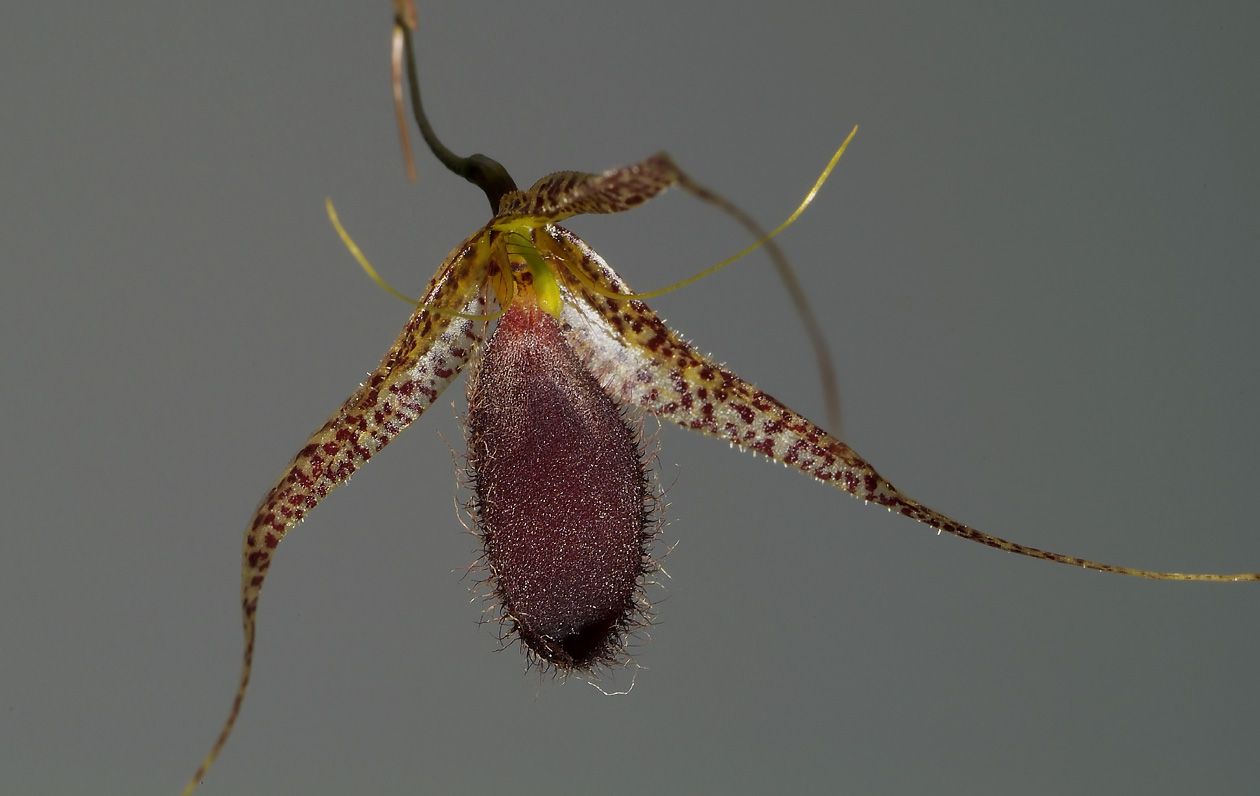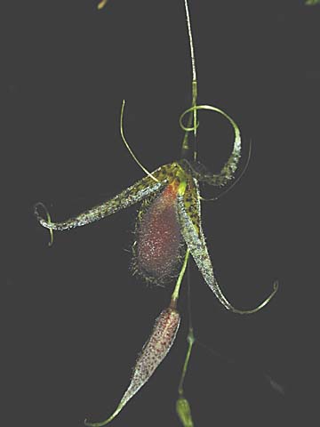The western slopes of the Andes in Ecuador around 1600 meters as a mini-miniature sized, cool growing epiphyte with erect ramicauls enveloped by 2 thin, tubular sheaths and carrying a single, apical, erect, coriaceous, narrowly obovate, subacute to obtuse, narrowly cuneate below into the petiolate base leaf that blooms in the summer on a filiform, loose, subflexuous, flexible, to 7.2" [18 cm] long, successively several flowered inflorescence.