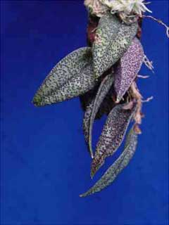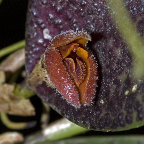 Found in eastern Ecuador and Peru in wet montane forests at elevations around 1050 meters as a mini-miniature sized, warm to cool growing epiphyte with stout, erect ramicauls enveloped by 1 to 2, inflated, sheaths and carrying a single, apical, prostrate, thickly coriaceous, elliptical, subacute, green with numerous black warty spots, the base broadly cuneate into the sessile base leaf that blooms in the spring on a very short, single flowered inflorescence arising from the base of the leaf through a crested, loose spathe.