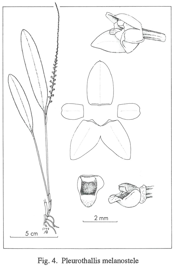 References W3 Tropicos, Kew Monocot list , IPNI ; *Orquideología 20: 74. Luer 1996 drawing fide; Icones Pleurothallidinarum Vol XVIII Systematics of Pleurothallis subsection Antenniferae, Longiracemosae, Macrophyllae-Racemosae and Subgenera Pseudsostelis and Acuminata Luer 1999 drawing fide; Orchids of Bolivia Vol 1 Pleurothallidinae Vasquez & Ibisch 2000 drawing fide; Icones Pleurothallidinarum Vol XXVI Luer 2004 drawing fide; Icones Pleurothallidinarum Vol XXVI Luer 2004 as Acianthera melanoglossa