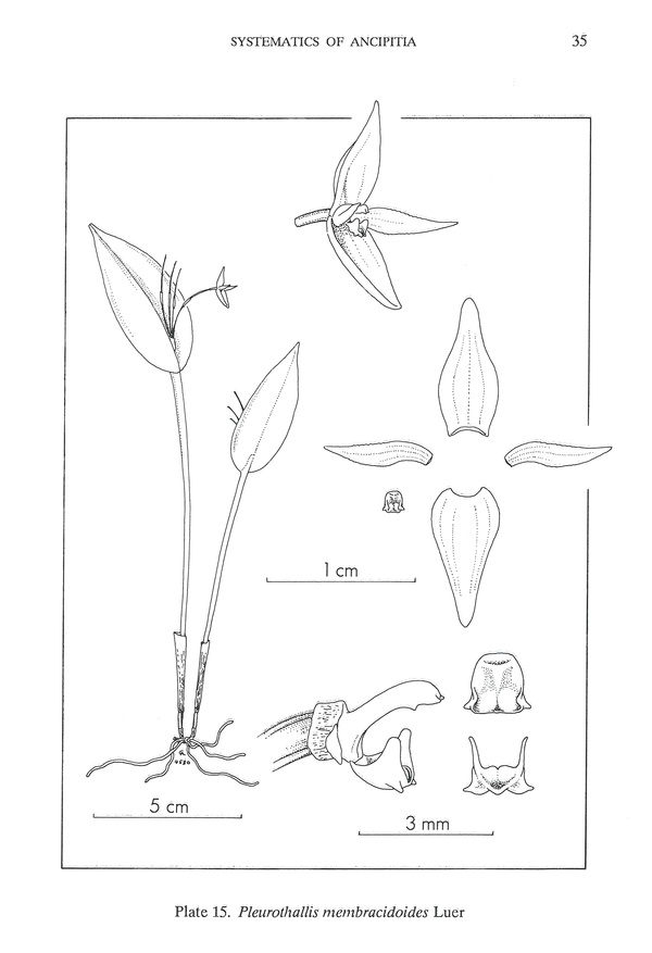 References W3 Tropicos, Kew Monocot list , IPNI ; Icones Pleurothallidinarum Vol III Luer 1986; Icones Pleurothallidinarum Vol VI Systematics of Pleurothallis subgen Ancipita, Scopula and Trisetella Luer 1989 drawing fide; Icones Pleurothallidinarum Vol XXVI Luer 2004 as Ancipitia membracidioides