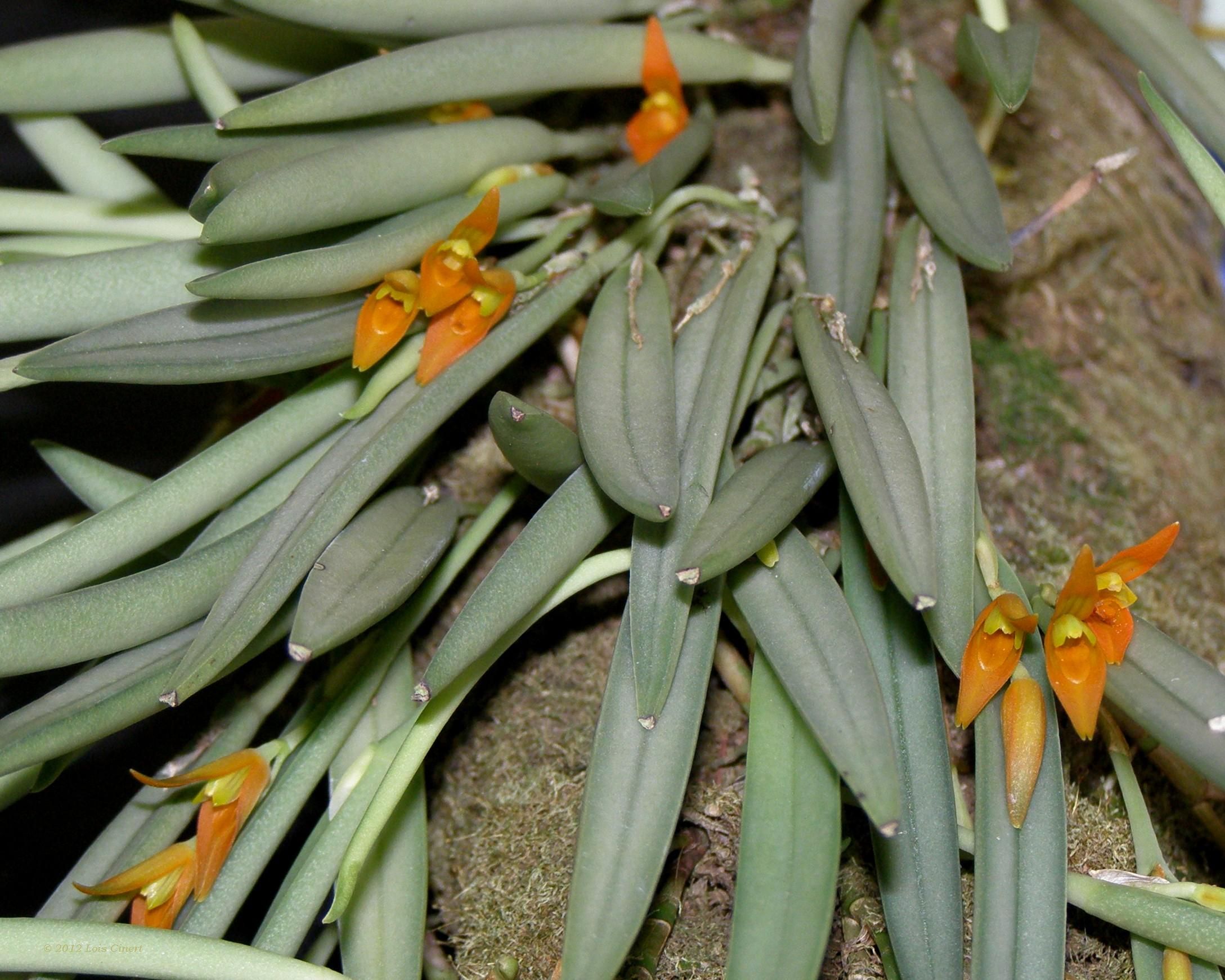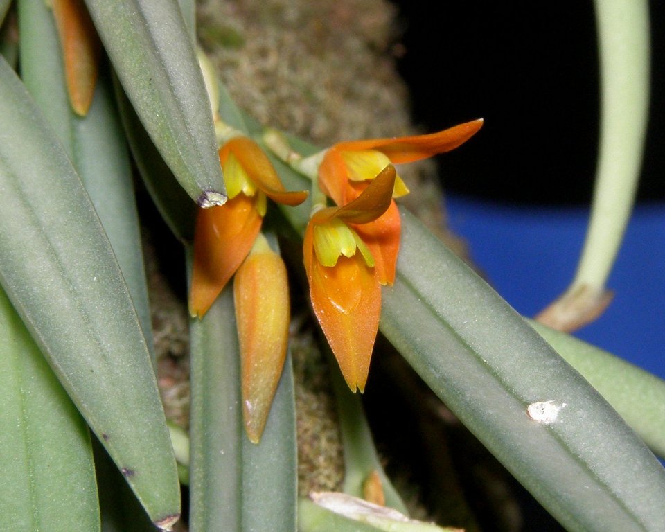 "the vegetative features of this species are distinctive. From a creeping rhizome, descending ramicauls are produced at intervals of about a centimeter to bear a thick, narrowly linear, pendent leaf. From the narrow base, a bright orange flower is borne singly or in a short, 2-flowered raceme." Carl Luer Selbyana 30: 1 Luer 2009