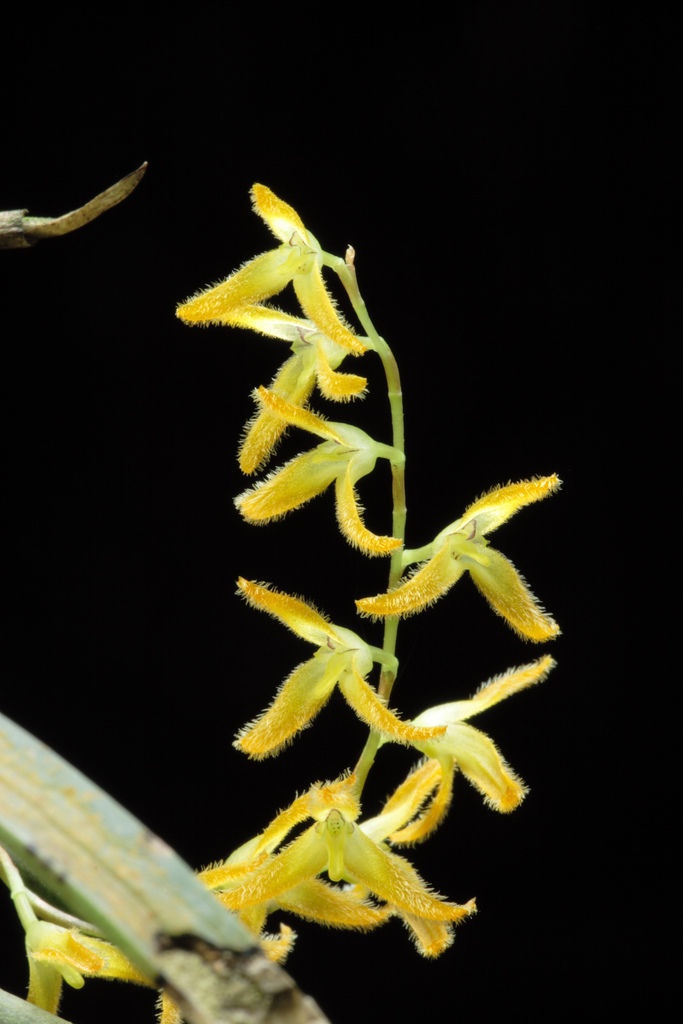 Found in Colombia and northwestern Venezuela in rain and cloud forests at elevations around 2000 meters as a miniature sized, cool to cold growing epiphyte with erect, terete ramicauls enveloped by 2 to 3 tubular sheaths and carrying a single, apical, erect, coriaceous, dusty grey green, very thick and hard fleshy, almost succulent, lightly concave to convex leaf that blooms in the winter on an erect, 2" [5 cm] long, several to many flowered inflorescence that is as tall or a little shorter than the leaf.