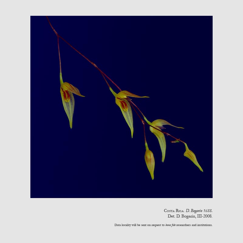 Found in Mexico, El Salvador and Nicaragua and Colombia in wet lowland rainforests as a miniature sized, hot to warm growing epiphyte occuring at elevations of 30 to 400 meters with a very short ramicaul enveloped below by a single, white, scarious sheath and carrying a single, apical, very small, tridenticulate apically, ovate, gradually rounded below into the short, petiolate base leaf that is held close up against and hugging the tree trunk and blooms in the summer and fall on a short to 1" [to 2.5 cm], successive [4 to 6] flowering inflorescence arising on new and old leaves.