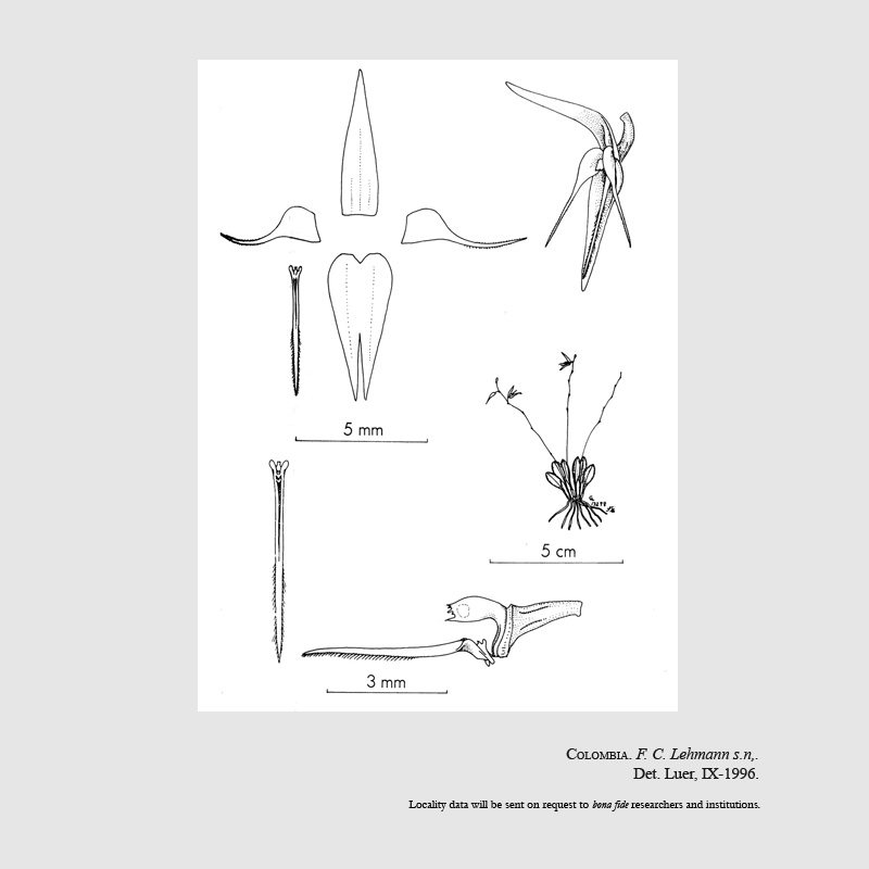 Found most likely in Colombia at an unknown locality and elevation as a mini-miniature sized, warm to cool growing epiphyte with slender, erect ramicauls enveloped by a loose ribbed, tubular sheath and carrying a single, apical, erect, rigid, coriaceous, obovate, obtuse, cuneate below into the ill defined petiolate base leaf that blooms on an erect, loose, 1.6 to 3.2" [4 to 5 cm] long including the .8" [2 cm] long peduncle, successively 4 to 6 flowered inflorescence arising laterally from the ramicaul.