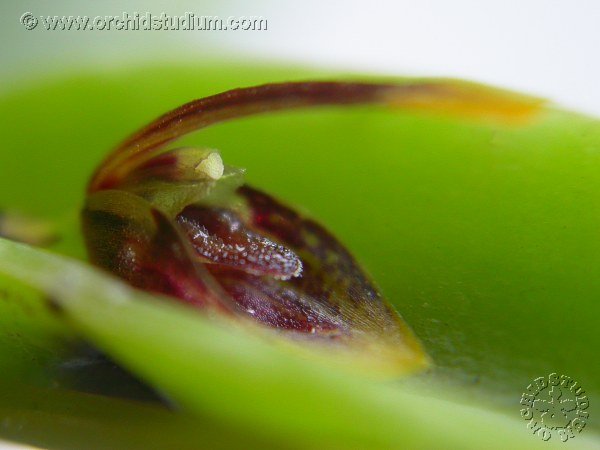 Found in Ecuador, Peru, Venezuela, Guyana, Fr Guiana, Surinam and Brazil in rain forests at elevations of 100 to 200 meters as a creeping, mini-miniature sized, hot growing epiphyte with an erect, slender, terete ramicaul enveloped by 2 to 3 tubular sheaths and carrying a single, apical, erect to suberect, coriaceous, light green, narrowly ovate, acute, cuneate below into the sessile base leaf that blooms in the late summer and early fall on a .06 to .1" [1.5 to 2.5 mm] long, successively single, 2 flowered inflorescence arising through a spathe at the base of the leaf.