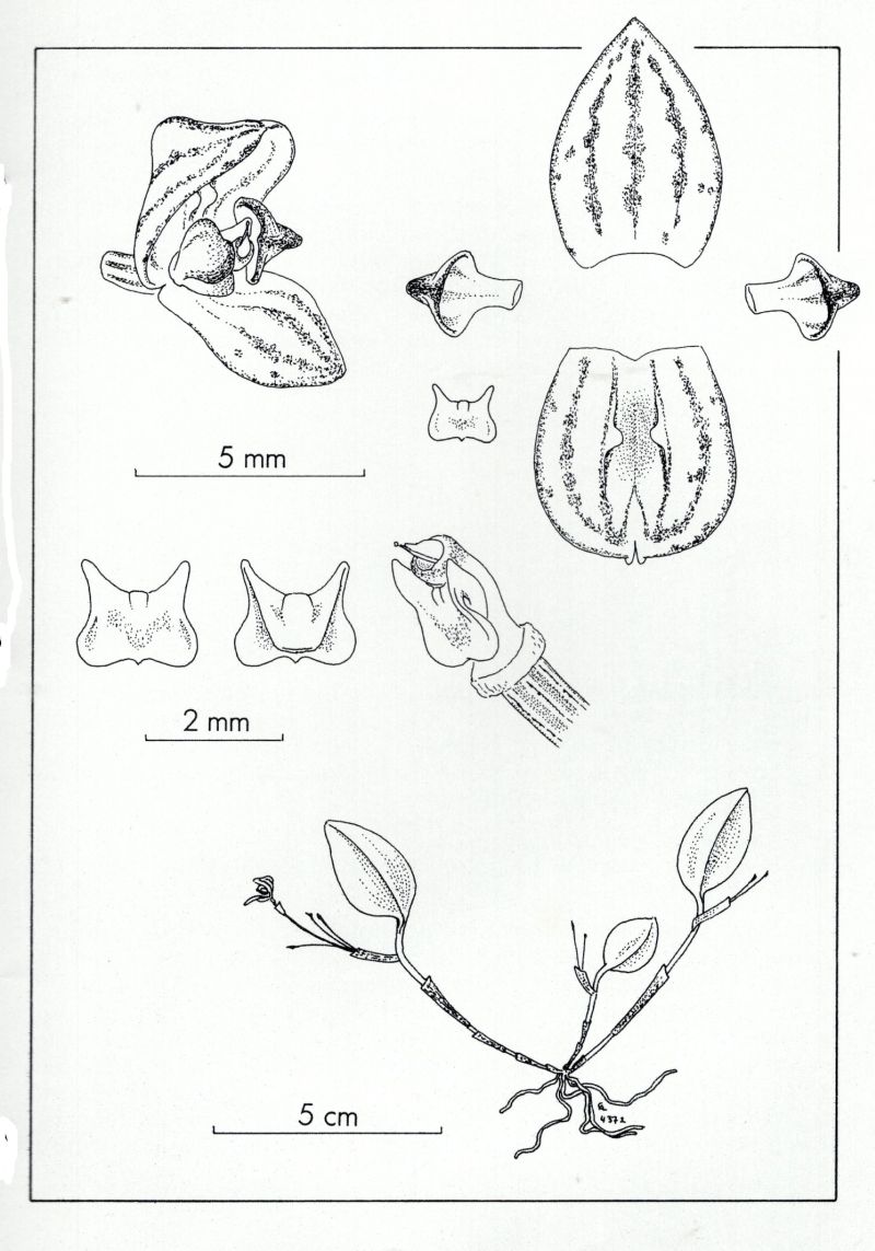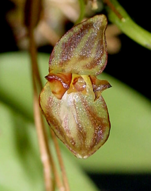 Found in Pichincha province of Ecuador at elevations of 1200 to 2500 meters as a mini-miniature sized, cool to cold growing epiphyte with slender, suberect ramicauls enveloped by 3 to 4, loose, ribbed sheaths and carrying a single, apical, erect, coriaceous, ovate, subacute, contracted and twisted into a bent petiolate base leaf that blooms in the winter on a capillary, 1/2 to 1" [1.2 to 2.4 cm] long, single flowered inflorescence enveloped completely by an erect spathe arising from near the apex of the ramicaul.