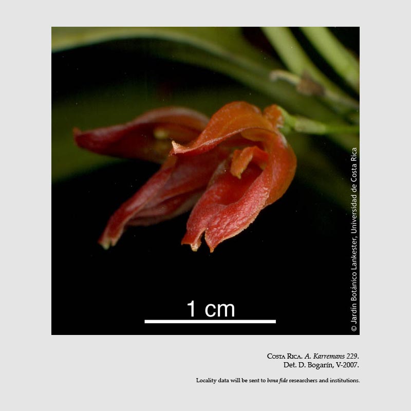 Found only in Costa Rica at elevations around 600 meters as a small sized, hot growing epiphyte with an erect, slender ramicaul enveloped by 2 to 3, tubular, acuminate sheaths and carrying a single, apical, erect, coriaceous, elliptic, acute, cuneate below into the elongate, channeled, petiolate base leaf that blooms in the summer on a .4 to .6" [1 to 1.5 cm] long, successively 2 flowered inflorescence arising from low on the ramicaul.