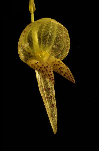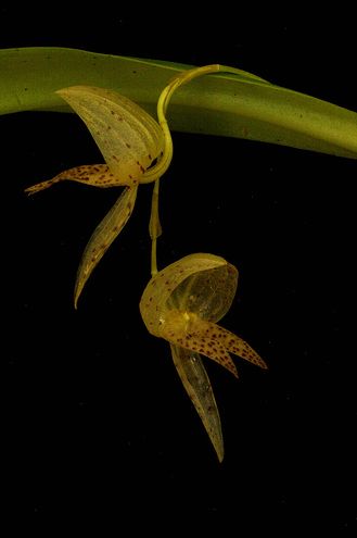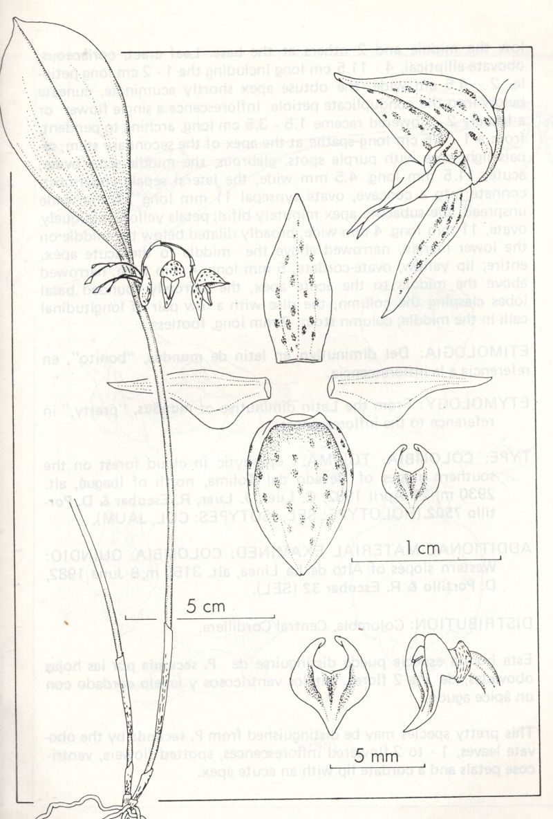 Characterized by the slender ramicaul carrying a single, obovate leaf blooming with a one to 2 flowered inflorescence of spotted flowers with ventricose petals and a deeply cordate lip with an acute apex." Luer 1999
