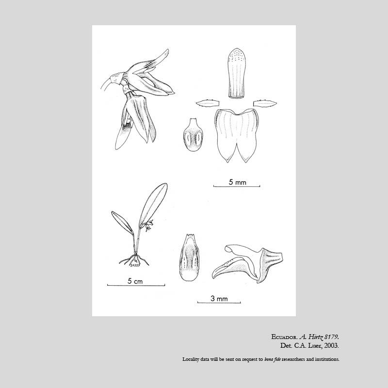 References W3 Tropicos, Kew Monocot list , IPNI ; *Orquideología Vol 22 #3 pg 267-269, 285. 2003 Luer & Hirtz drawing fide; Icones Pleurothallidinarum Vol XXVI Luer 2004 as P erebatensis [P nanella]drawing fide;