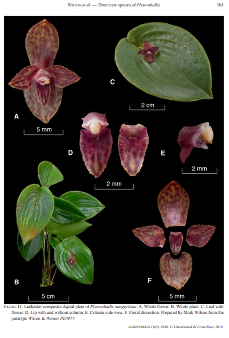 "Pleurothallis nangaritzae is recognized by its large leaf size to flower size ratio; glossy, heavily veined leaf; broad petals; and papillate acute lip with shallowly bilobed glenion." Mark Wilson, Luis Baquero, Katharine Dupree, Marco M. Jiménez, Cheryl M. LeBlanc, Gilberto Merino, Jose Portilla, Marcos Salas Guerrero, Francisco Tobar Suárez & Jon D. Werner 2016