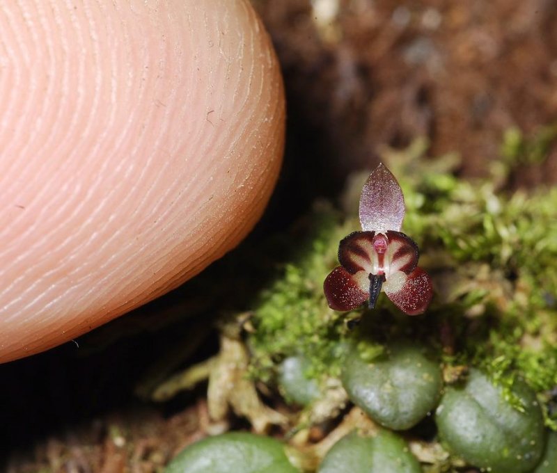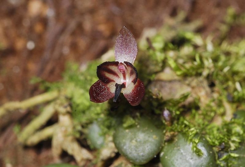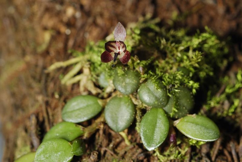 Found in Venezuela, Ecuador and Bolivia in open scrubby forests at elevations of 120 to 300 meters as a mat-forming, mini-miniature sized, hot growing epiphyte with a branching repent rhizome with closely spaced, flatly adpressed to the branch, size and fleshiness variable, suborbicular to ovate, rounded apically leaves that blooms on a basal, short to .15" [4mm], successively single to four flowered inflorescence with tubular close floral bracts that conceal most of the pedicel.