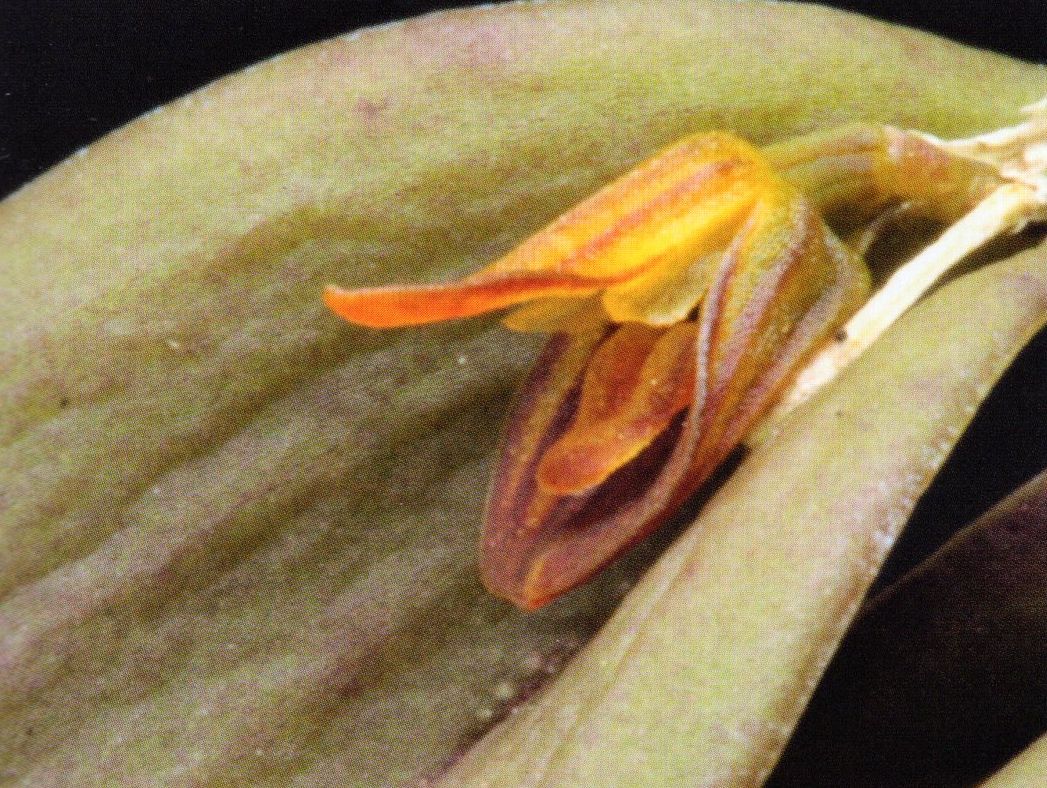 Found in eastern Brazil at elevations around 800 to 1000 meters as a mini-miniature sized, warm to cool growing epiphyte with pendent ramicauls enveloped by 2 sheaths and carrying a single, apical, erect, coriaceous, conduplicate, lanceolate, leathery, dark olive green leaf that blooms in the summer and fall on a .6 to 1" [1.5 to 2.5 cm] long, simultaneously 2 to 3 flowered inflorescence
