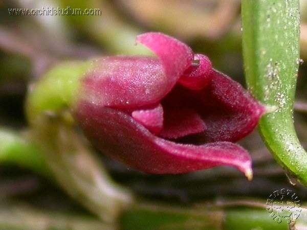 Found in Sao Paulo state of Brazil as a mini-miniature sized, hot to warm growing epiphyte with an elongate, cylindrical rhizome enveloped by hairy sheaths and giving rise to a secondary stem every .8 to 1.2" [2 to 3 cm] carrying a single, apical, parellel to the substrate, green, elliptical, entire, acute, shortly conduplicate into the canaliculate, pseudo-petiolate base leaf that blooms in the spring on a basal, short, single flowered inflorescence