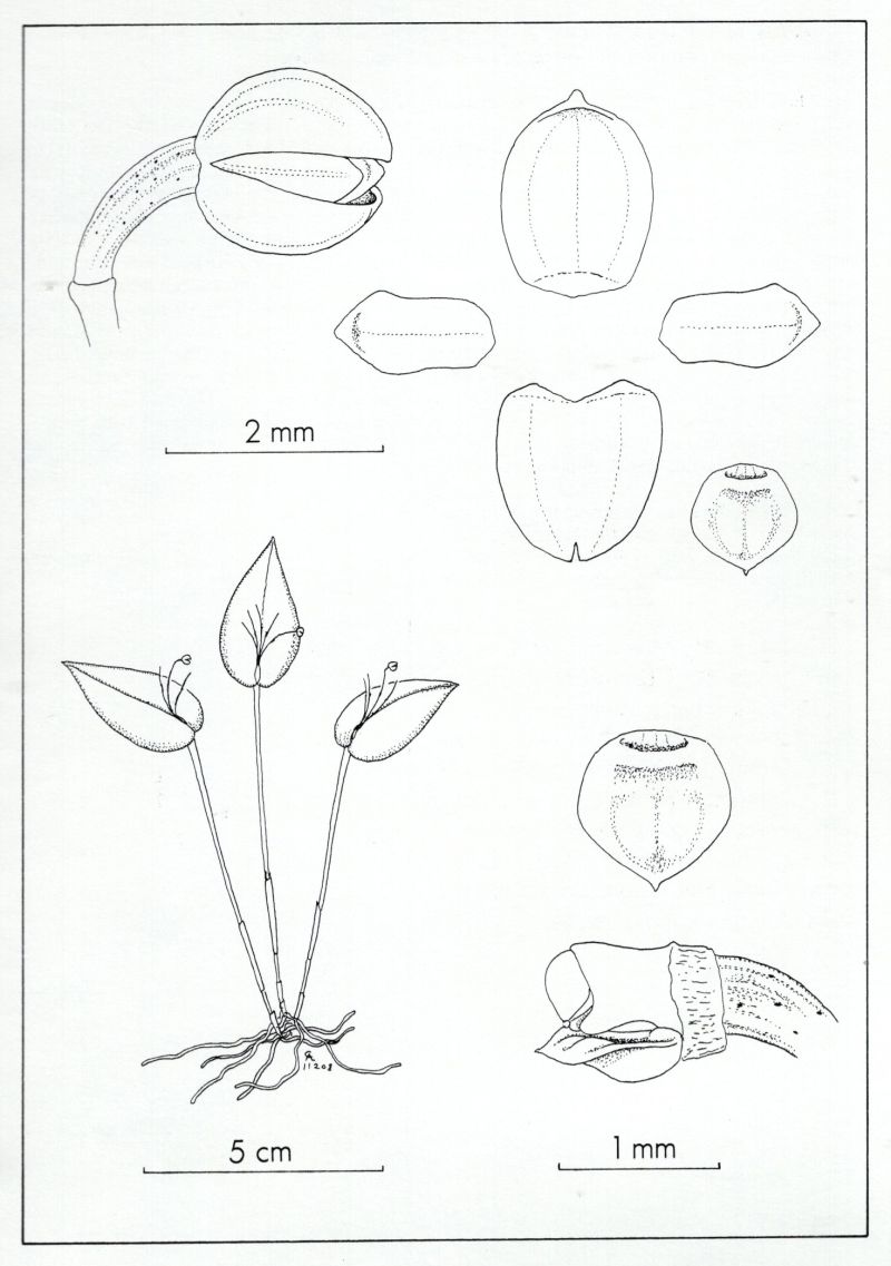 Found in Ecuador in cloud forests at elevations 500 to 1650 meters as a miniaturesized, warm to cool growing epiphyte with erect, slender, laterally compressed above the middle, subtended by 2 to 3 sheaths and another above the base carrying a coriaceous, somewhat spreading, ovate, acute leaf with a rounded, shallowly cordate, sessile base that blooms at most any time of the year on a 1/2" [1.25 cm] long, fascile of solitary, successive flowers arising from aa reclining spathe with glabrous, snow white flowers.