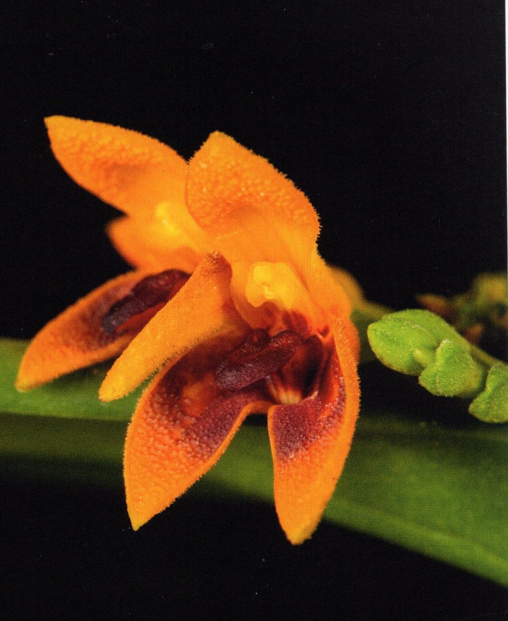 A small sized, hot to warm growing, epiphytic species from Colombia, Ecuador, Peru, Bolivia, Brazil and Paraguay and found in wet montane forests and evergreen forests at altitudes of 250 to 1450 meters with a channeled ramicaul with 2, basal, tubular sheaths and carrying a single, apical, oblanceolate, shortly decurrent, obtusely bilobed or retuse, thickly coriaceous, gradually narrowing below into the channeled petiolate base leaf that blooms on an apical, short, few to many flowered, fasciculate inflorescence enveloped by 2 to 4, basal tubular bracts that is held at the leaf base and has a foul odor all occuring in the winter and spring.