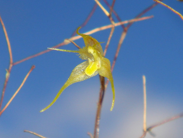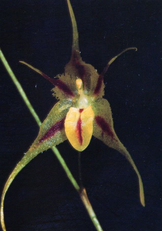 Found in Ecuador in wet montane forests at elevations around 2700 to 2800 meters as a mini-miniature sized, cold growing epiphyte with slender, erect ramicauls enveloped by 2, thin, tubular sheaths and carrying a single, apical, erect, coriaceous, narrowly obovate, subacute to obtuse, gradually narrowly cuneate intot he petiolate base leaf that blooms late spring and early summer on an erect, loose, filiform, to 4" [10 cm] long, successively several flowered inflorescence arising laterally from the ramicaul.