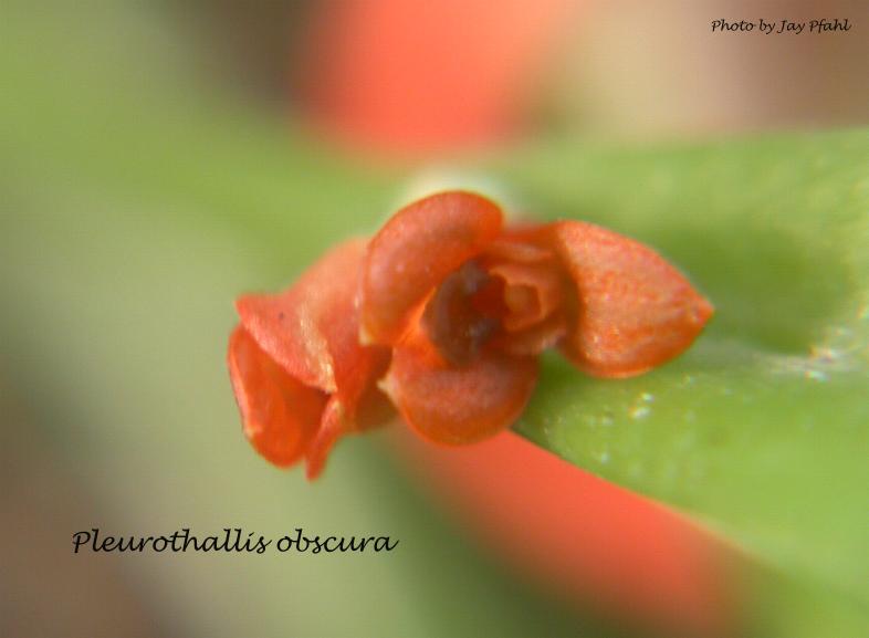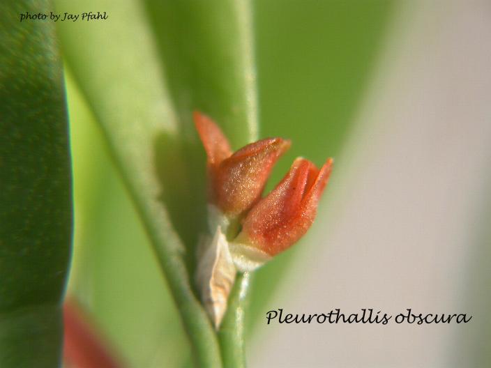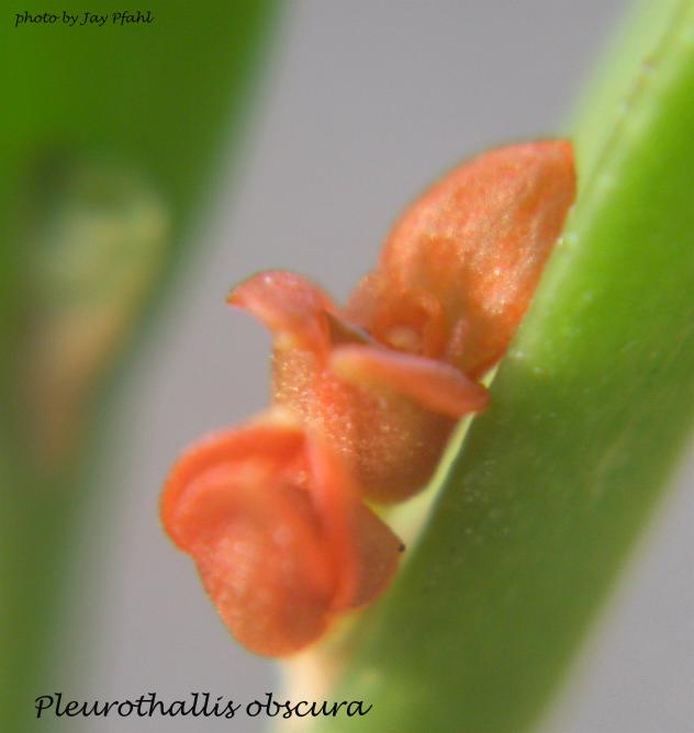 Plant epiphytic, small, shortly repent to caespitose, the secondary stem terete with 2 to 3 tubular sheaths below, shallowly channeled above, 2.4 to 4" [6 to 10 cm] long, Leaf thickened, very narrowly ovate to linear, acute tridenticulate, sessile, 2.8 to 4.4" [7 to 11 cm]. Inflorescence a fascicle of a few (2-3), short 2 to 3 flowered racemes; peduncles stout about .2" [5 mm] long, from the axil of the leaf; spathe about .12" [3 mm] long. Flowers small, bilabiate, fleshy, orange, externally sparsely verrucose; floral bract infoundibular, .08" [2 mm] long; pedicel stout, .08" [2 mm] long; ovary minutely verrucose, about .6" [1.5 mm] long; dorsal sepal elliptical, obtuse, convex above the middle, concave below the middle, .13 x .043" [3.25 x 1.75 mm]; lateral sepals connate into a suborbicular, concave lamina, obtuse, retuse, 3x3.5mm, bicarinate externally; petals elliptical, upper margin angled, acute, serrulate, yellow with 3 orange veins; lip ovate, fleshy dilated below the middle with the margins turned up. From the latin obscurus, "hidden" or "obscure", referring to the small flowers Type Mexico without locality This species is from the eastern declivity of the central highlands of Mexico and Guatemala at elevations around 1200 to 1800 meters as a small sized, cool growing epiphyte is characterized by a rather stout, channeled stem and a thick but narrow, rigid, sulcate leaf about the same length. A small cluster of orange flowers borne on a few abbreviated racemes appears at the base of the leaf. As in some other species, the flowers appear superficially to be in a single flower fascicle. With time the very small fleshy warty flowers turn cinnabar-red. The lateral sepals are united into a semiorbicular retuse lamina, the margins of which evert to expose the thickened lip, while the dorsal sepal reflexes above. The sides of the lavellum below the middle are erect, and centrally there are a pair of rounded lamellae