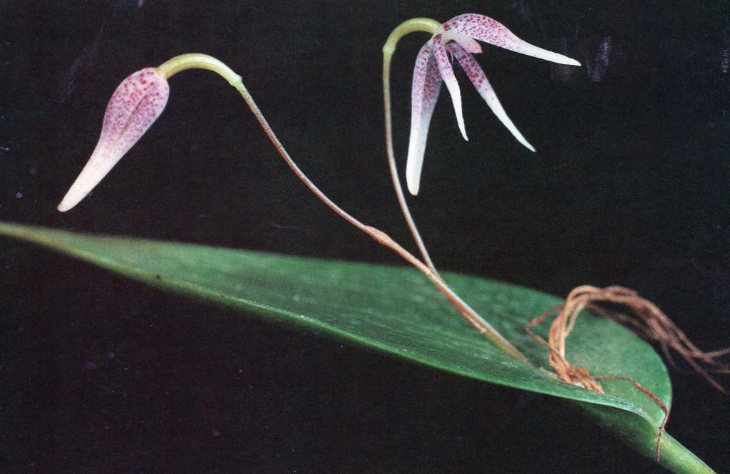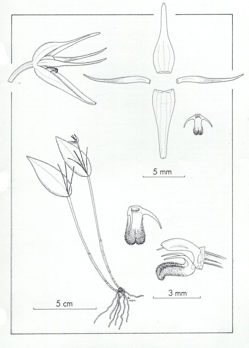 Found in Colombia in wet forests at an elevation of 2280 meters as a small sized, cold growing epiphyte with erect, slender, sharply ancipitous ramicaul with a tubular bract above the base and 2 to 3 at the sheaths base carrying a single, apical, coriaceous, suberect to spreading, ovate, acute, shallowly cordate, sessile leaf with the base rounded that blooms in the late summer and early fall on a fascile of solitary successive flowers arising from a reclining spathe at the base to the leaf with the peduncle 1/8" [1 to 1.2 mm] long and it has a single floral bract.
