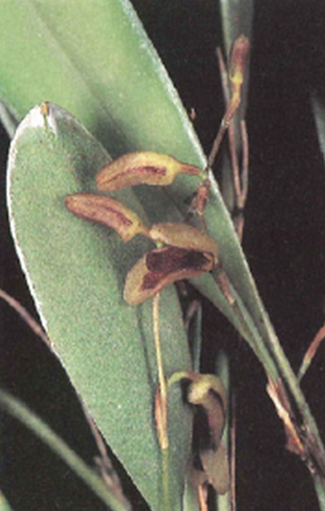 Found in Morelos and Guerrero states of Mexico at elevations of 2250 to 2400 meters as a mini-miniature to miniature sized, cold growing epiphyte with erect, slender ramicauls enveloped by a tubular, sheath about the middle and others near the base and carrying a single, apical, erect, fleshy coriaceous, more or less purple suffused, narrowly elliptical-obovate, subacute to obtuse, narrowly cuneate below into the subpetiolate base leaf that blooms in the summer and fall on an erect, lax, subsecund, , 2.8 to 4" [1.5 to 3.5 cm] long including the .4 tyo .8" [1 to 2 cm] long peduncle, successively single, few flowered inflorescence arising through a spathe from near the apex of the ramicaul and has a tubular floral bract.