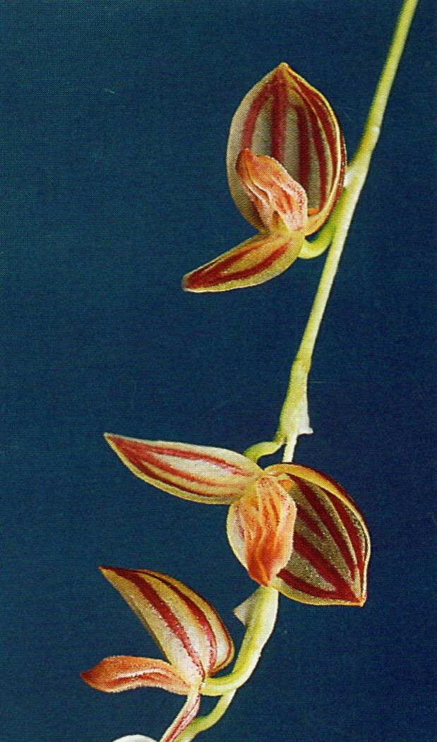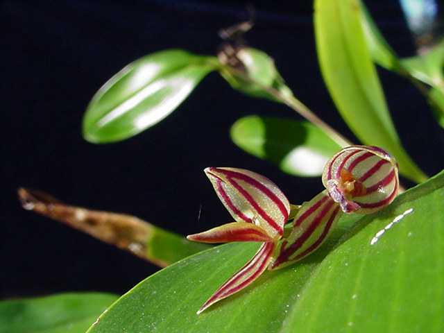 "Disitinguished by the stout ramicaul carrying a single, ovate, cordate leaf that blooms on an arching raceme of relatively large flowers with sepals intenely striped in purple, extremely thick petals adherent to each other and a rounded, bicallous, minutely denticulate lip with broad basal lobes clasping the column." Luer 1999