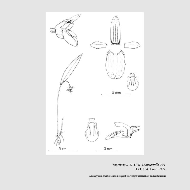 Found in Amazonas and Apure states of Venezuela at elevations around 150 to 175 meters as a miniature sized, hot growing epiphyte with erect, slender ramicauls enveloped at the base by 2 to 3, tubular sheaths and carrying a single, apical, erect, coriaceous, narrowly elliptical, acute, cuneate below into the sessile base leaf that blooms in the summer on a slender, arising through a spathe at the base of the leaf, arching, .2" [5 mm] long, becoming slightly thicker towards the apex, congested, 2 to 3 flowered inflorescence with longer than the ovary floral bracts.
