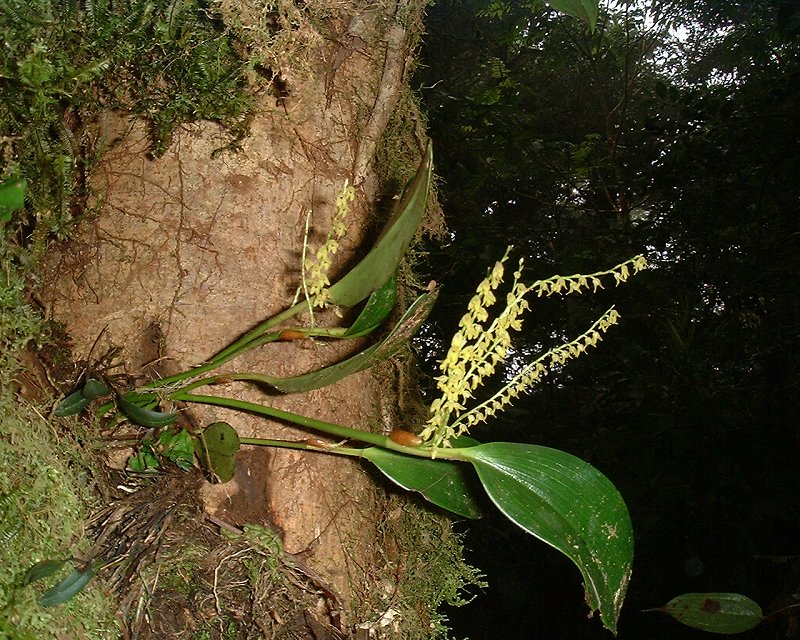 Found in the Jamaica, Mexico, Guatemala, El Salvador, Honduras, Nicaragua, Costa Rica, Panama, Colombia and Venezuela at altitudes up to 1800 meters in wet, exposed locations often in scrub forest as a small to just medium sized, hot to cool growing epiphytic or occasional lithophytic species is with erect, terete, ramicauls carrying a single, apical, coriaceous, linear to oblong-elliptic or oblanceolate, retuse and obtuse apically, gradually narrowing below into the conduplicate, petiolate base leaf that blooms mostly in the summer on an apical, erect, simple, to 15" [38 cm] long, simultaneously opening, many flowered inflorescence subtended by a compressed sheath carrying sweetly scented flowers held all to one side of the inflorescence which extends well above the leaves.