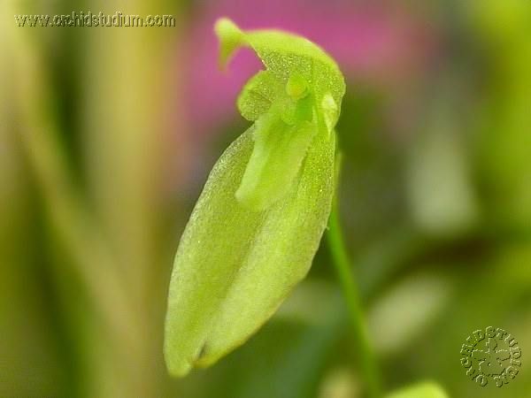 Found in Bahia and Rio de Janiero states of Brazil in shady forests at elevations of 200 to 300 meters as a mini-miniature sized, hot growing epiphyte with erect, slender ramicauls enveloped by 3 to 4 loose, glabrous, tubular sheathsand carrying a single, apical, erect, coriaceous, ellipitcal, subacute, cuneate below intio the petiolate base leaf that blooms in the summer on an erect, slender, .8 to 1.6" [2 to 4 cm] long, single flowered inflorescence arising from near the apex of the ramicaul..