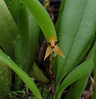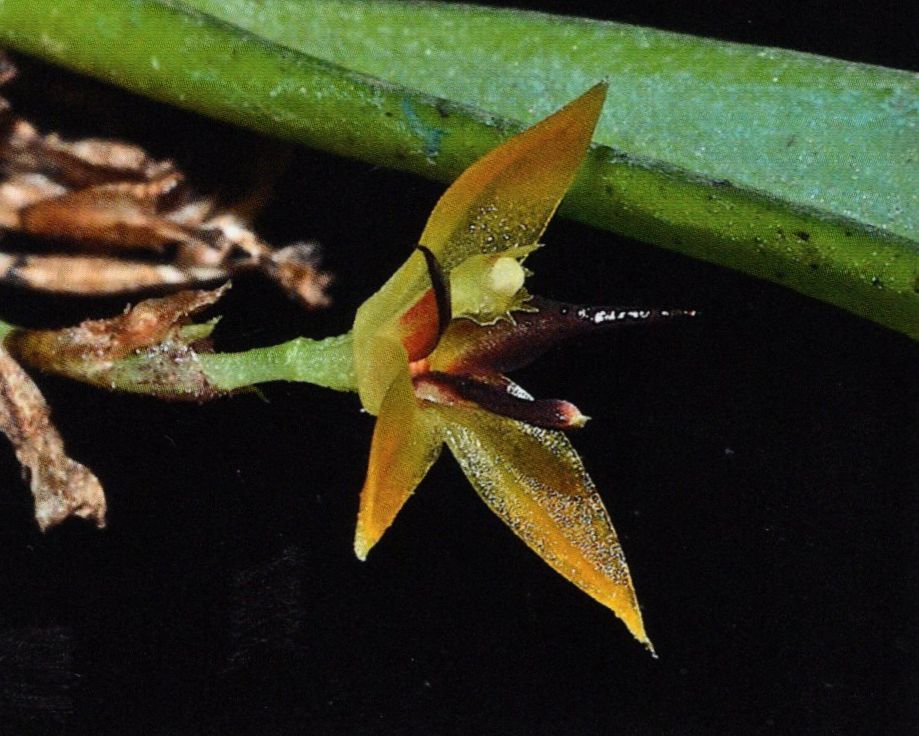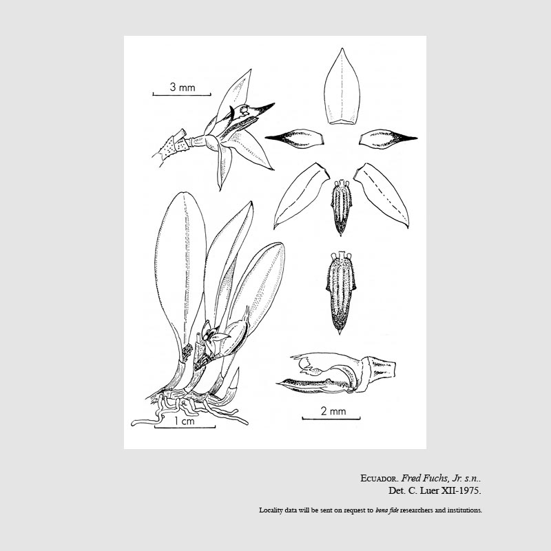 Found in Ecuador and northern Peru in wet montane forests at elevations around 1500 to 2800 meters as a mini-miniature sized, cool to cold growing epiphyte with erect ramicauls enveloped basally by 2 tubular sheaths and another below the middle and carrying a single, apcial, erect, coriaceous, elliptical, acute, acuminate, cuneate below into the sessile base leaf that blooms in the spring on 1 to 4, erect, dense, 3.2 to 6.4" [ 8 to 16 cm] long, simultaneously many flowered, racemose inflorescence arising through a spathe at the base of the leaf with tublar floral bracts.