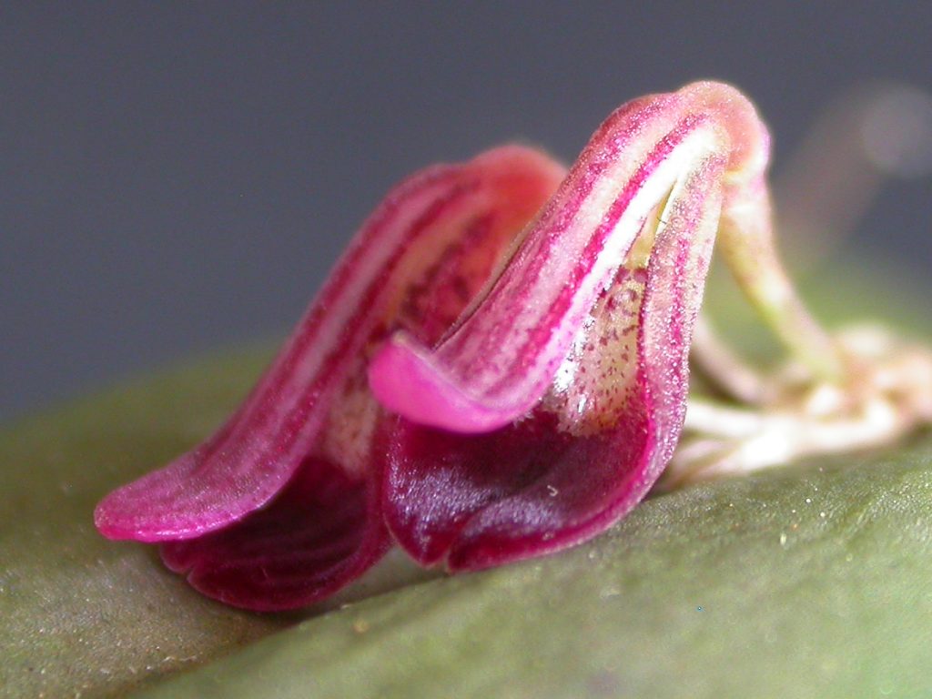 Found in Rio de Janiero Brazil at elevations around 1300 meters as a miniature sized, warm to cool growing epiphyte with erect, bent ramicauls enveloped by 3 short lived sheaths and carrying a single, apical, erect, coriaceous, ovate, acute, succulent-like, shell shaped, dark olive green to purple, conduplicate leaf that blooms in the summer through fall on to 3, in a fascile, .28" [7mm] long, single flowered inflorescence