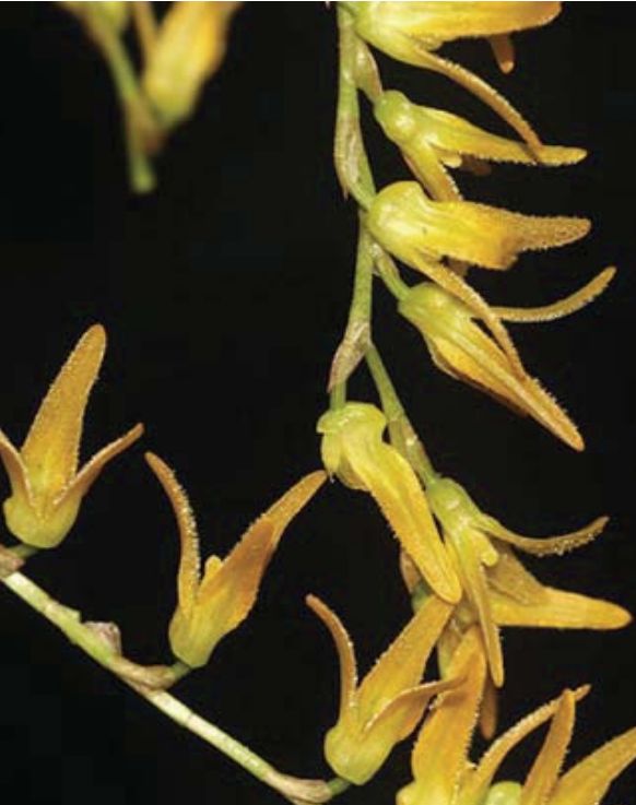 Found in Bolivia at elevations around 2500 to 3300 meters as a miniature to medium sized, cold growing epiphyte with an erect, slender to stout ramicaul enveloped by a tubular sheath near the middle and 2 to 3 others at the base and carrying a single, apical, erect, coriaceous, elliptical, subacute to obtuse, narrowly cuneate below into the petiolate base leaf that blooms in the later spring and summer on 1 to 2, loose, subsecund, .08" [12 to 27 cm] long including the 1.2 to 2" [3 to 5 cm] long peduncle, simultaneously many flowered inflorescence arising through a spathe from an annulus below the apex of the ramicaul.