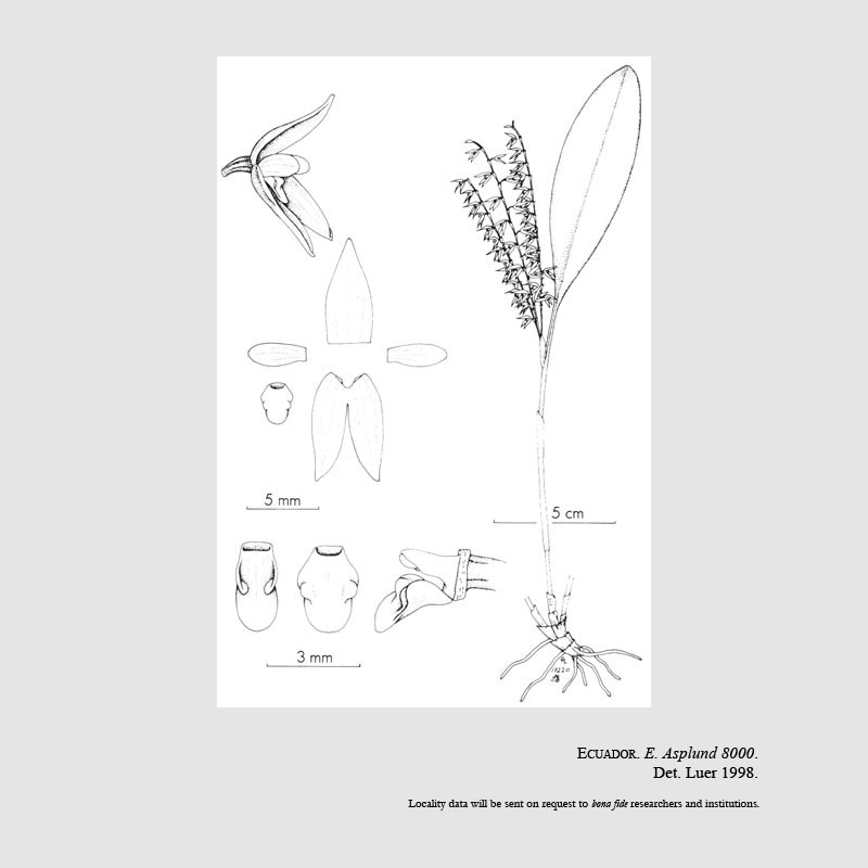 Found in Tungurahua Ecuador in cloud forests at elevations of 3050 meters as a miniature sized, cold growing epiphyte with fasciculate, slender, erect enveloped by a tubualr sheath about the middle and 2 to 3 imbricating sheaths at the base and carrying a single, apical, erect, coriaceous, elliptical, subacute to obtuse, cuneate below into the petiolate base leaf that blooms in the spring on 2 to 3, subsecund, subdense, 2.4 to 4.4" [6 to 11 cm] long, simultaneously several flowered inflorescence arising througha slender spathe with an infundibular floral bract
