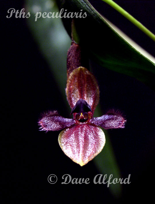 "This species is related to P troglodytes but differs in the acutely deflexed, purple mottled, narrow, acuminate, incurved leaf that is deeply cordate at the base and a flower arises from an erect spathe. The obtuse sepals amd the spathulate petals are long pubescent near the margins. The lip is transversely trilobed and the lateral lobes acute and below the middle and with the middle lobe rounded and verrucose with minutely erose margins." Carl Luer