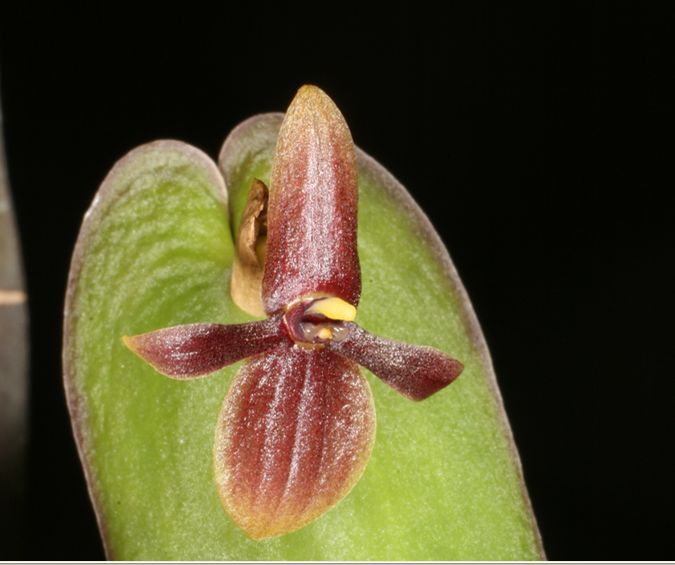 Found in El Oro Ecuador without specific locality as a miniature sized epiphyte with slender, erect ramicaul enveloped by a tubular sheath on the lower quarter and 2 more at the base and carrying a single, apical, spreading, coriaceous, ovate, acute, cordate below into the sessile base leaf that blooms in the spring on a fascile, 1/2 to .6" [1.2 to 1.6 cm] long, successive single few flowered inflorescence arising through a narrow spathe with a tubular floral bract