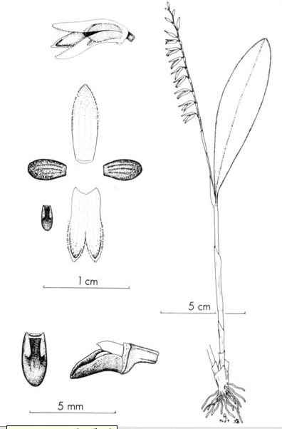 Found in Azuay Ecuador in montane scrub at elevations around 3000 meters as a miniature sized, cold growing epiphyte with fasciculate, erect ramicaul enveloped by a tubular sheath near the middle and 2 to 3 more at the base and carrying a single, apical, spreading, coriaceous, elliptical-oblong, subacute to obtuse, cuneate below into the petiolate base leaf that blooms in the spring on a subdense, secund, 4.8 to 5.6" [12 to 14 cm] long, simultaneously many flowered inflorescence arising through a slender spathe with an annulus