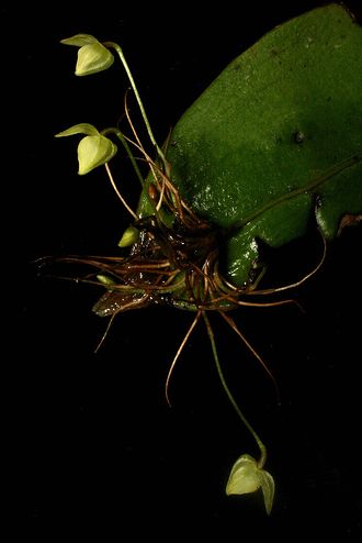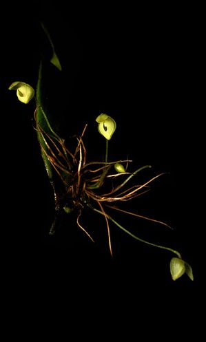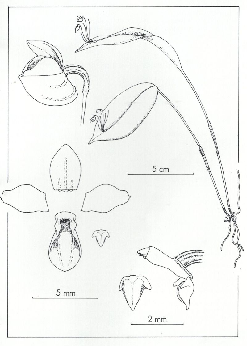 Found in Narino and Valle de Cauca departments of Colombia on the western slopes of the western Cordillera in cloud forests at elevations around 1600 to 1840 meters as a small sized, cool growing epiphyte with slender, erect ramicauls enveloped by a tubular sheath below the middle and 2 others at the base and carryring a single, apical, erect, thinly coriaceous, elliptical, acute, lightly acuminate, narrowly cuneate and long-decurrent below into the ramicaul that blooms in the winter and spring on a fascile of .28 to .32" [7 to 8 mm] long, successive, single flowered inflorescence arising through a spathe held towards the apex of the leaf and has a thin floral bract.