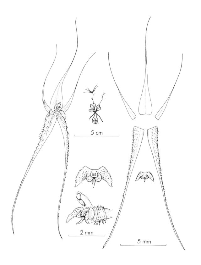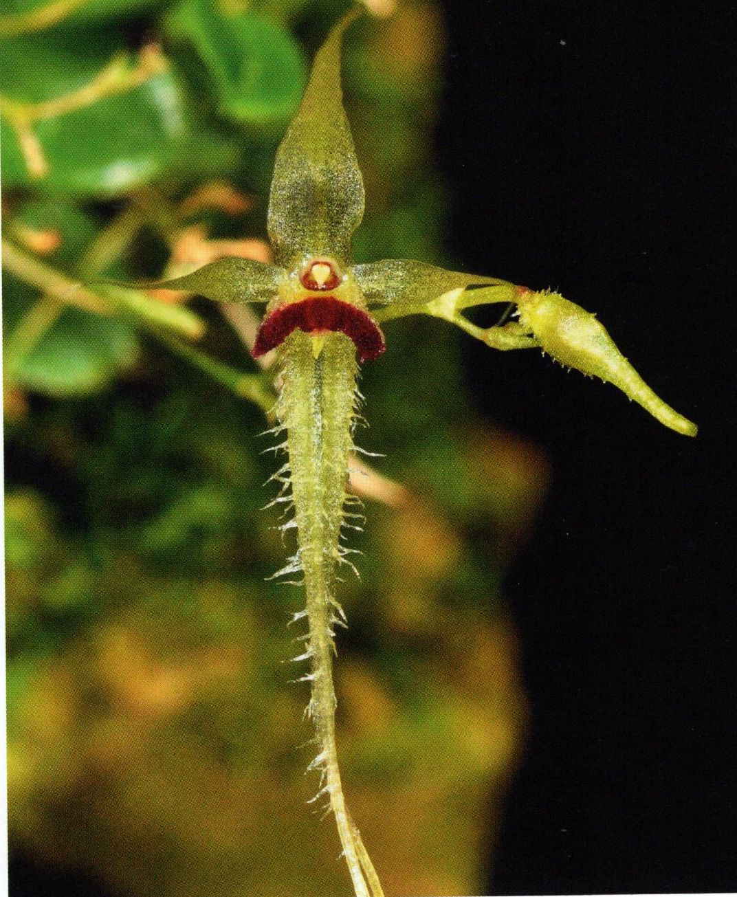 Found in Zamora Chinchipe province of Ecuador at elevations around 2000 meters as a mini-miniature sized, cool to cold growing epiphyte with slender, erect ramicauls with 1 to 2, loose, ribbed tubular sheaths and carrying a single, apical, erect, coriaceous, elliptical, obtuse, margin denticulate towards the apex, cuneate below into the petiolate base leaf that blooms in the fall on a capillary, lateral, .72" [1.8 cm] long, successively few flowered inflorescence with oblique, acute floral bracts