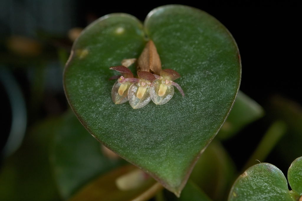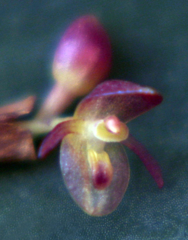 Found in Ecuador in elfin forests and along roadbanks at elevations of 1000 to 1800 meters as a small to medium sized, warm to cool growing terrestrial or epiphyte with suberect, slender ramicauls enveloped basally by 1 or 2, closely apressed, tubular sheaths and another below the middle and carrying a single, apical, spreading, often suffused with purple, thickly coriaceous, rigid, concave, ovate, acute, basally sessile, deeply cordate and with overlapping lobes, leaf that blooms on a fascile of successive single [sometimes more] flowered infloresence arising through a spathe and has thin tubular floral bracts..