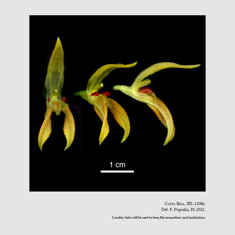 Found in Costa Rica and Panama in moist lowland forests at elevations around 500 meters as a miniature to small sized, hot growing epiphyte with slender, erect ramicauls enveloped by 2 glumaceous, slightly loose, ancipitous, acute, tubular sheaths and carrying a single, apical, erect, subcoriaceous, elliptical, minutely retuse, margins ancipitious, narrowing below into the conduplicate, petiolate base leaf that blooms in the late fall and early winter on an erect to subarching, congested, strongly fractiflex rachis, to 25.2" [63 cm] long including the 11.2" [28 cm] long, flattened, ancipitous peduncle, successively to 30+ flowered inflorescence arising laterally from the apex of the ramicaul with 3 to 4 distant, tubular-amplectent, ancipitous, apically subuncinate, acute bracts and an infundibuliform, subuncinate laterally, ovate, abaxially ancipitous, subacuminate floral bract.