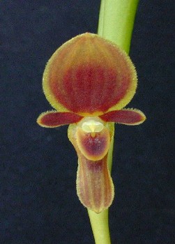 Found in Cauca and Valle de Cauca departments of Colombia in wet montane forests at elevations of 2000 to 2600 meters as a small to medium sized, cold growing epiphytye with an erect, slender ramicaul with a close tubular sheath on the lower third and 2 others at the base and carrying, a single, erect, coriaceous, narrowly elliptic-obovate, subacute, slightly acuminate, narrowly cuneate below into the sessile base leaf that blooms in the fall on a fascile of successive, single flowered inflorescence arising through a narrow spathe and has tubular floral bracts.