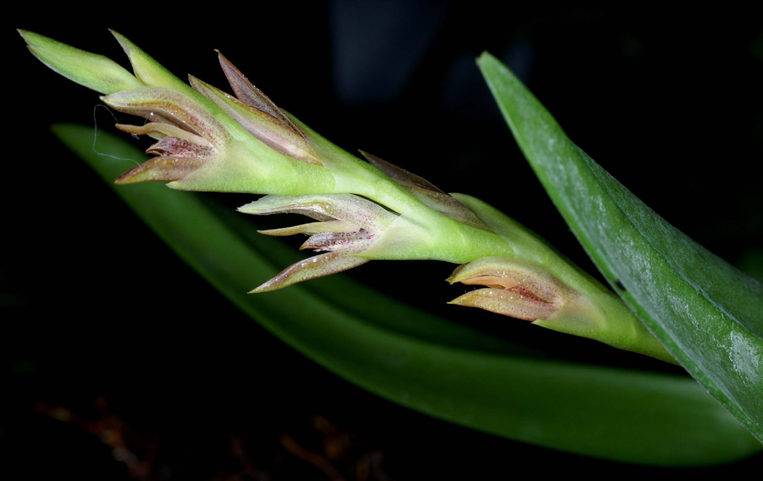 Found in Espirito Santo, Rio de Janiero, Minas Gerais, Sao Paulo, and Parana States of Brazil at elevations around 900 to 1300 meters as a medium to large sized, warm to cool growing epiphyte with laterally compressed ramicauls enveloped by 3 tubular sheaths and carrying a single, apical, erect, leathery, narrowly ovate, conduplicate, grass to yellow green with red margined leaf that blooms in the winter on a spicate, laterally compressed, to 8" [to 20 cm] long including the 3 to 3.6" [7.5 to 9 cm] long, peduncle, simultaneously 10 to 15 flowered inflorescence arising through a spathe.