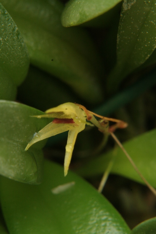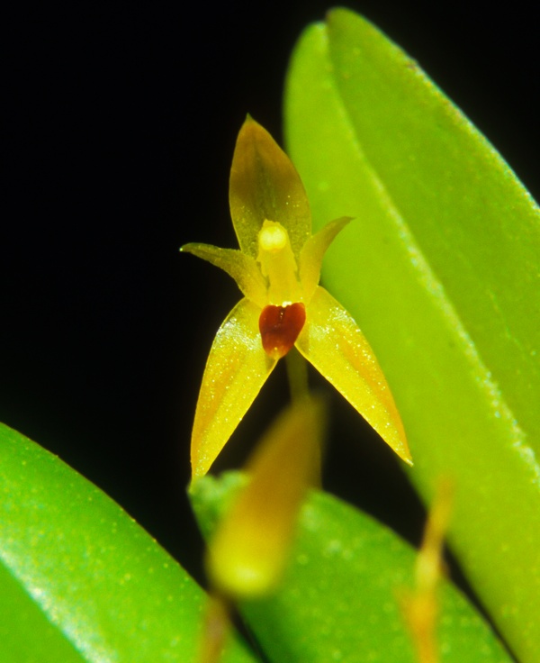 Found from Panama, Trinidad & Tobago, Surinam, Fr Guiana, Guyana, Venezuela, Colombia, Ecuador, Peru and Bolivia at elevations of 100 to 1000 meters as a mini-miniature sized, hot to warm growing epiphyte with suberect, stout ramicauls enveloped by a tubular sheaths and carrying a single, apical, suberect, coriaceous, elliptical, subsessile, subacute to rounded apically, cuneate below into the subpetiolate base leaf that blooms in the spring, summer and fall on an erect, lax, .1 to .2" [2 to 5mm] long, successively single to 2 flowered, racemose inflorescence artising from a node below the base of the leaf.
