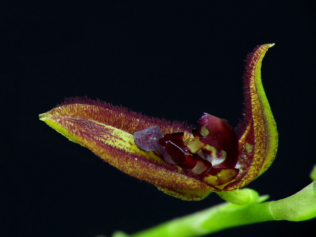 Found in Costa Rica and Panama at elevations around 1500 to 1600 meters as a small sized, cool growing epiphyte with slender, erect ramicauls enveloped basally by 2 to 3 thin, tubular sheaths and carrying a single, apical, erect, coriaceous, narrowly elliptical, narrowly obtuse to subacute apically, narrowly cuneate below into the petiolate base leaf that blooms in the late summer and fall on a slender, loose, secund, 6.8 to 9.2" [17 to 23 cm] long, simultaneously several flowered inflorescence arising from near the apex of the ramicaul with oblique, acute floral bracts.