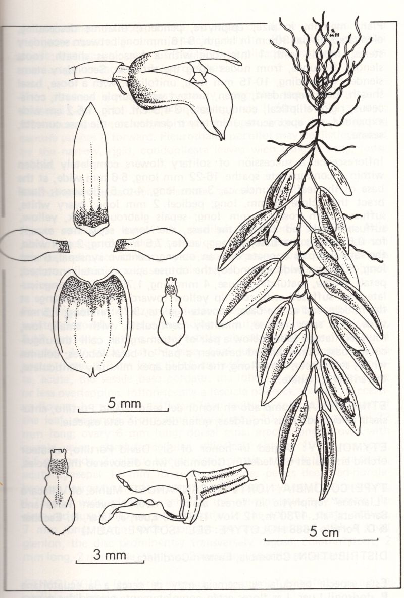 Found in Norte de Santander Colombia on the eeastern cordillera of the Andes at elevations around 1700 meters as a small sized, warm to cool, pendant growing epiphyte with ramicauls enveloped by 2, fugacious, ablique, tubular sheaths and carrying a single, pendant, thinly coriaceous, mottled purple beneath, elliptical, slightly conduplicate, acute to subacute, cuneate at the sessile base leaf that blooms on a short, congested, successively 4 to 5 flowered, racemose inflorescence arising through a large, inflated, leaf-like sheath at the base of the leaf.