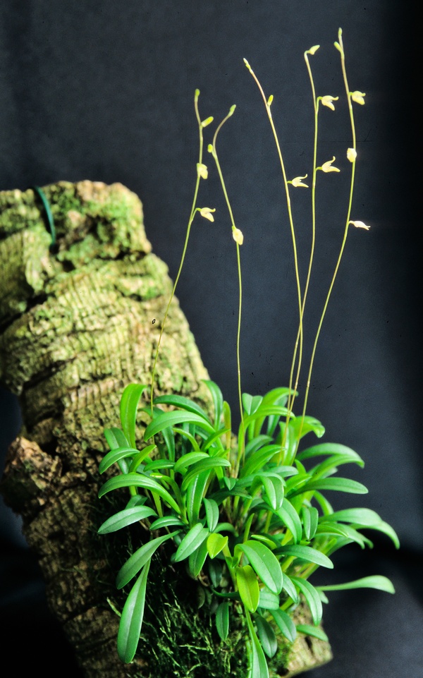 Found in Ecuador in wet montane forests at elevations around 2000 to 2800 meters as a miniature sized, cool to cold growing epiphyte with erect ramicauls carrying a single, apical, erect, elliptical, obtuse, gradually narrowing below into the base leaf that blooms in the fall and winter on an erect, 10" [25 cm] long, successively few flowered inflorescnece arising from the base of the ramicaul.