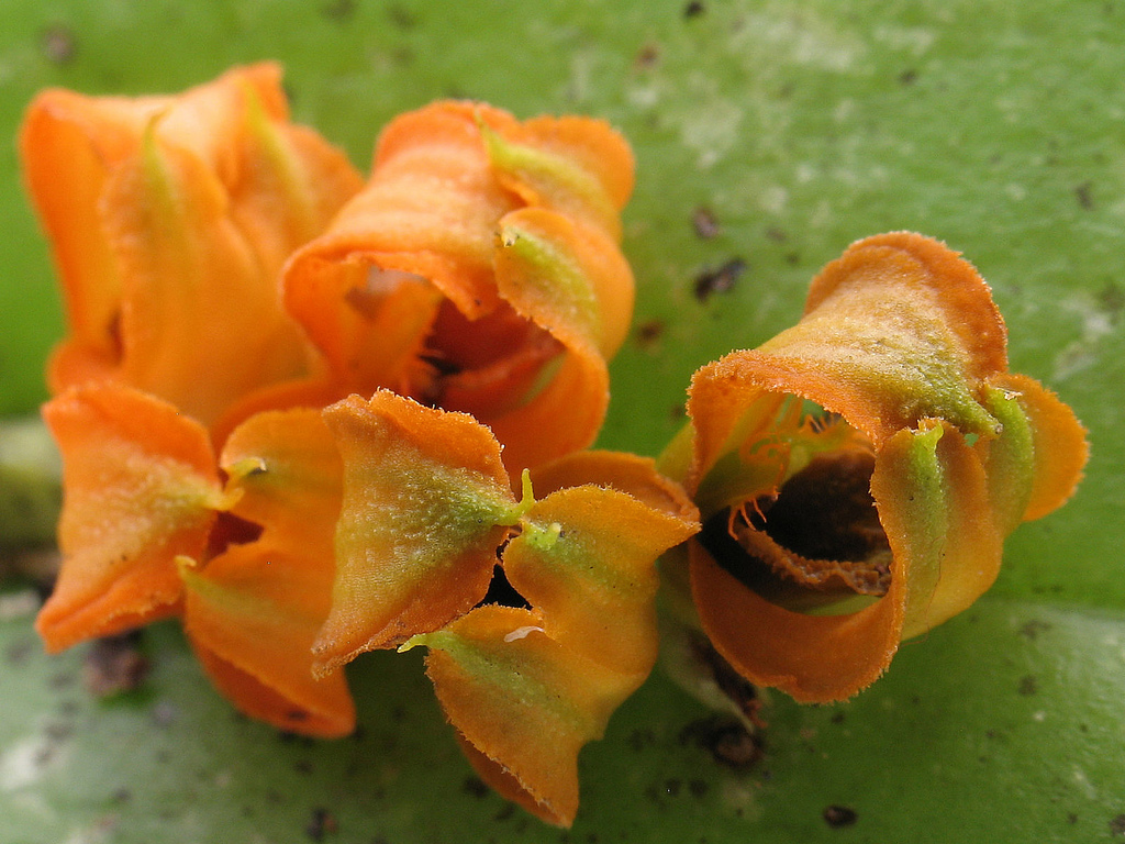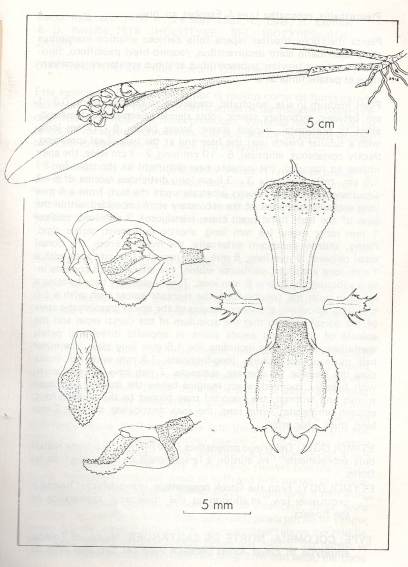 Found in Norte de Santander department of Colombia in cloud forests at elevations of 650 to 1800 meters as a small sized, warm to cool growing epiphyte with suberect to horizontal, winged above, terete below ramicauls enveloped by a tubular sheath at the base and another above and carrying a single, apical, spreading, thickly coriaceous, elliptical, obtuse to rounded, cuneate and decurrent base leaf that blooms in the spring on a 1.2 to 1.4" [3 to 3.5 cm] long, distichous, racemose, 6 to 7 flowered inflorescence arising through a short spathe, with simultaneously opening flowers prostrate against the leaf