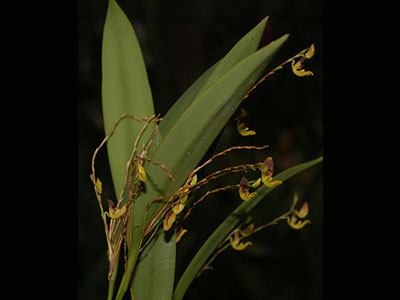 Found in Cauca Colombia at elevations around 1200 to 1400 meters as a small sized, warm to cool growing epiphyte with an erect, slender ramicaul enveloped by a close, tubular sheath below the middle and 2 to 3 above the base and carrying a single, apical, erect, coriaceous, narrowly elliptical, acute, narrowly cuneate below into the slender petiolate base leaf that blooms in the earlier fall on 1 to 2, erect, distichous, 2 to 3.2" [5 to 8 cm] long including the 1.l2" [3 cm] long peduncle, simultaneously few flowered inflorescence arising through a spathe near trhe apex of the ramicaul and carries non-resupinate flowers.