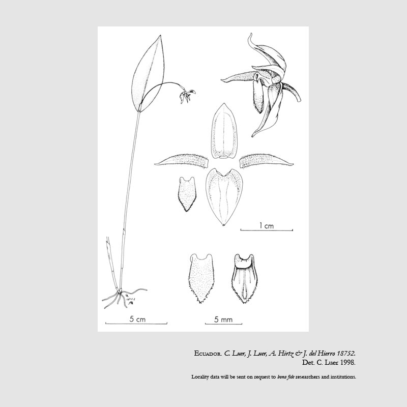 Found in Carchi Ecuador in cloud forests at elevations around 3300 meters as a small sized, cold growing epiphyte with slender, erect ramicauls enveloped by a close, tubular sheath below the middle and 2 to 3 others at the base and carying a single, apical, erect to more or less spreading, coriaceous, elliptical ovate, acute, slightly acuminate, cuneate below into the sessile base leaf that blooms in the summer on slender, 1.6" [ 4 cm] long, successively, single, few flowered inflorescence arising through a spathe at the base of the leaf with infundibular floral bracts.