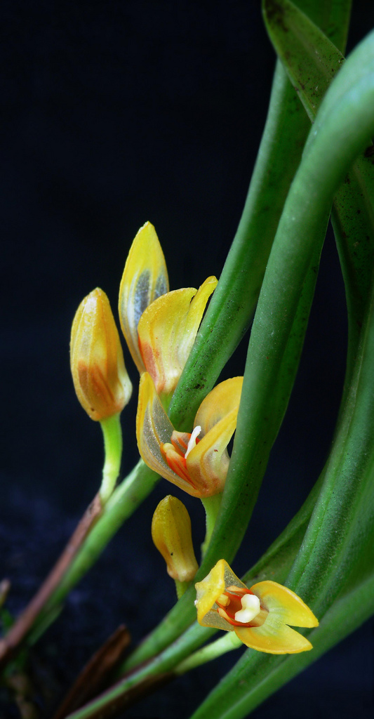 Found in Cartago Costa Rica in lower rainforests at elevations around 900 to 100 meters [if this determination is correct] as a mini-miniature sized epiphyte with short, erect ramicauls enveloped by a close, loose tubular sheath and another at the base and carrying a single, apical, erect, thickly coriaceous, linear-oblong, convolute, acute, cuneate below into the subpetiolate base leaf that blooms in the summer on a fascile of .28 to .56" [.7 to 1.4 cm] long, single flowered inflorescence arising through a sheath at the base of the leaf.