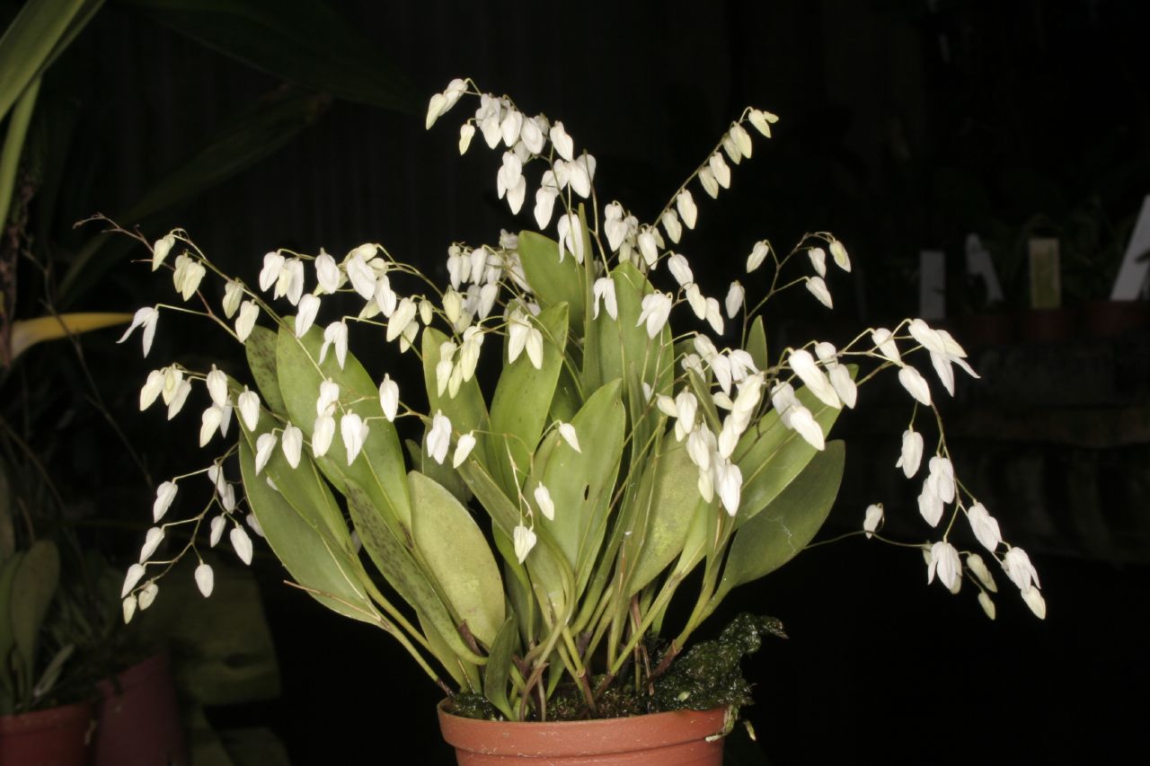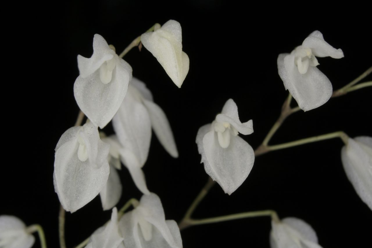 This miniature sized, cool to warm growing epiphytic species that occurs in the southeast Atlantic forests of Brazil from Sao Paulo to Espirito Santo at elevations around 732 meters where it is a variable bloomer on an apical, erect, thin, 6" [15 cm] long, fractiflex, racemose, few flowered inflorescence holding the flowers just above or amid the leaves and they are fragrant [lily of the valley], long-lasting small flowers that open simultaneously.